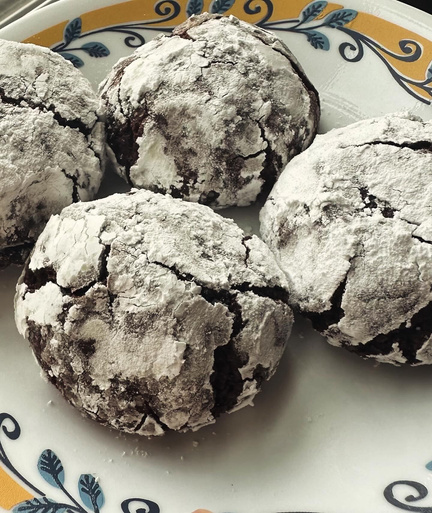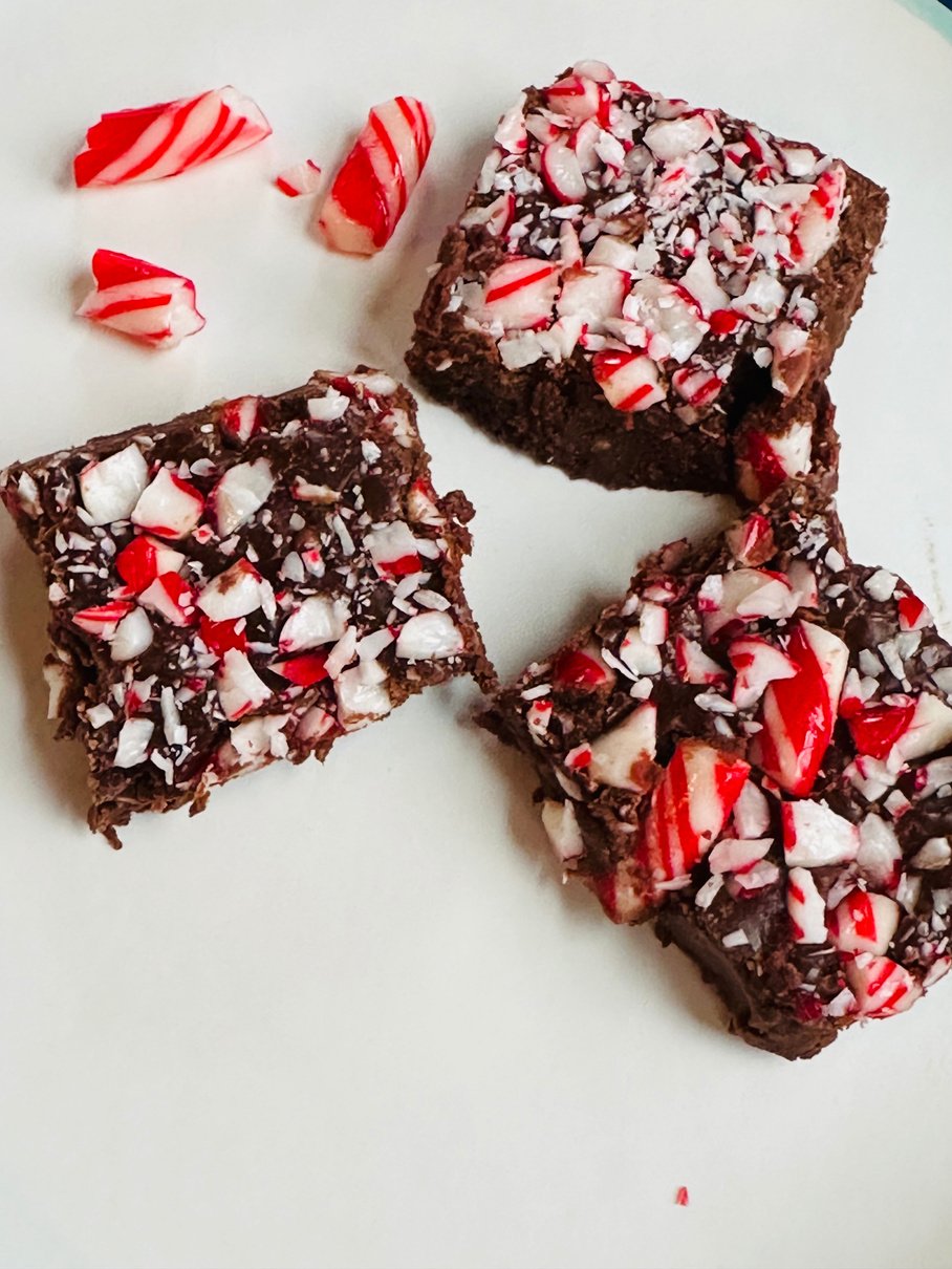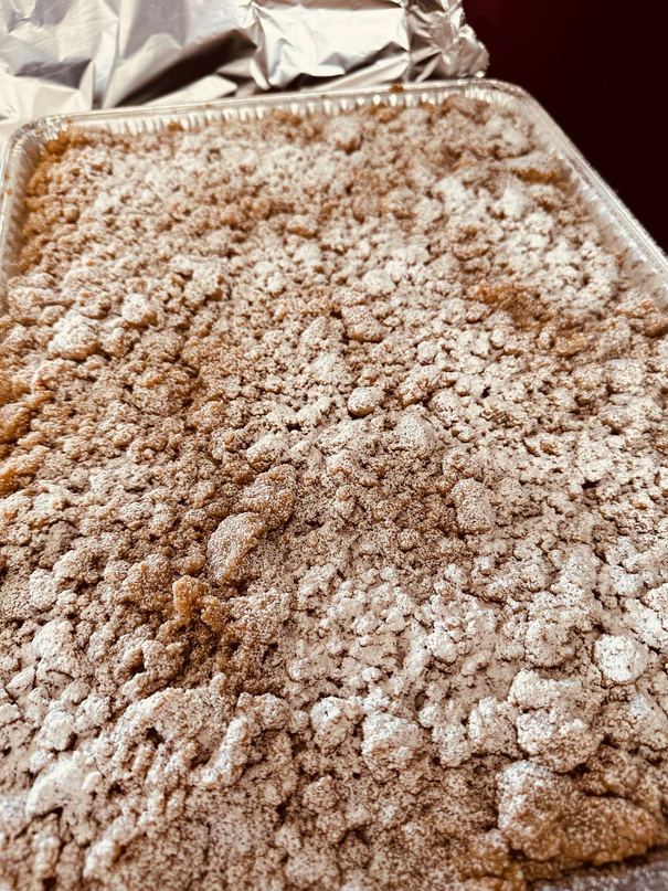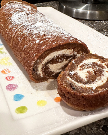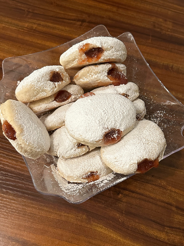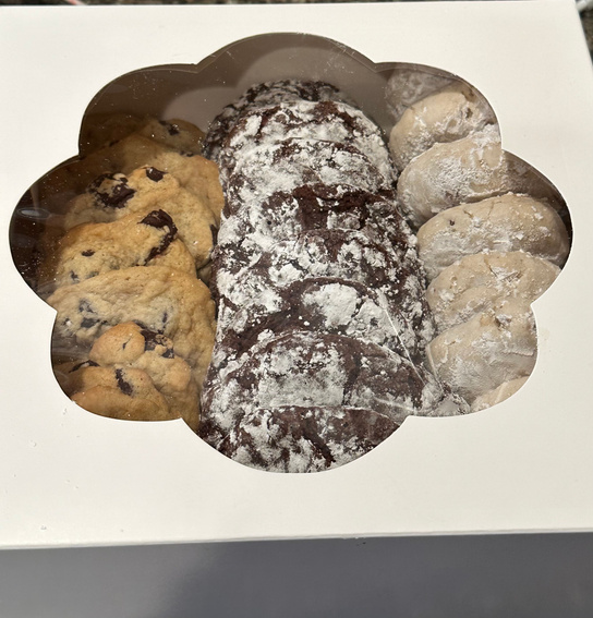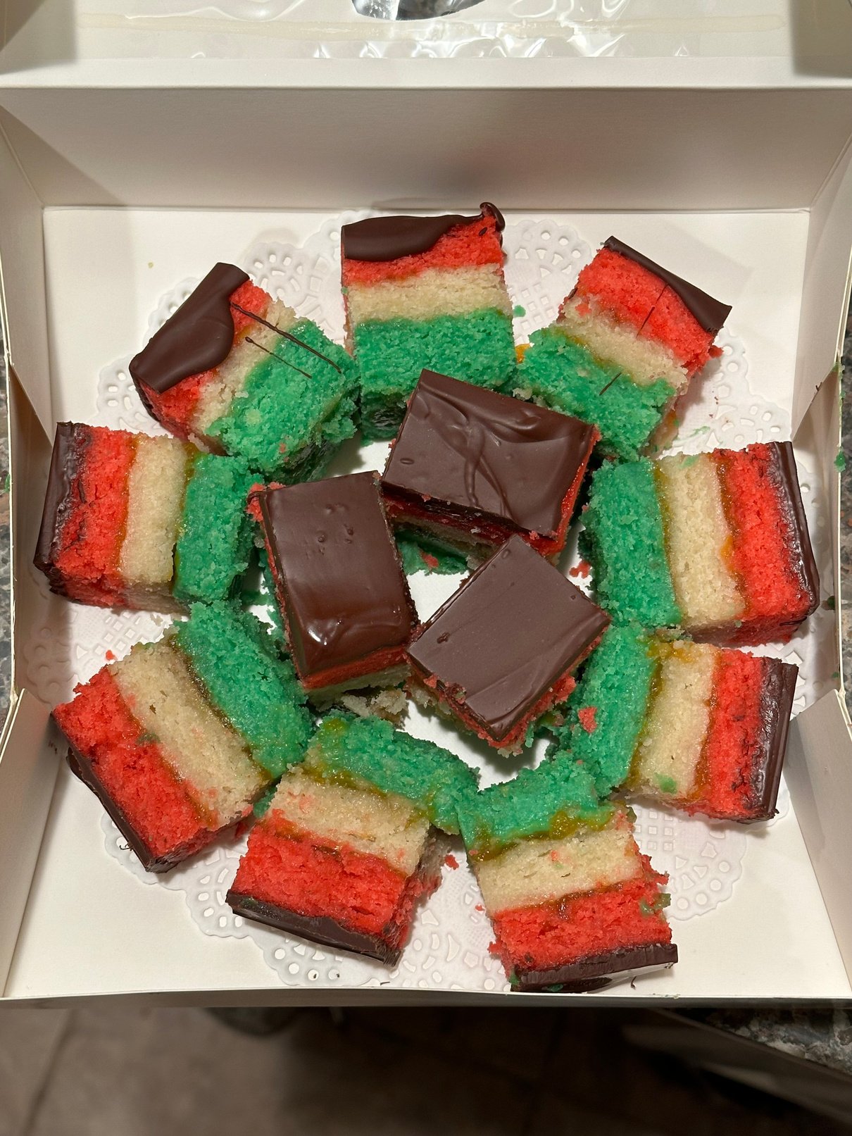 From top left: Pumpkin Roll with sweet cream, Rainbow Cookies, Candy Cane Fudge, Crumb Cake, Sufganiyot